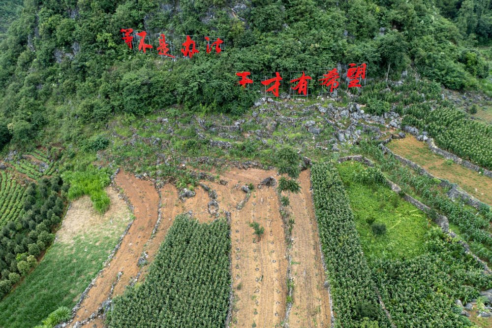 7月27日,一位村民在木者村“摸石谷”中建成的“三保”臺地上干農(nóng)活。新華社記者 楊植森 攝