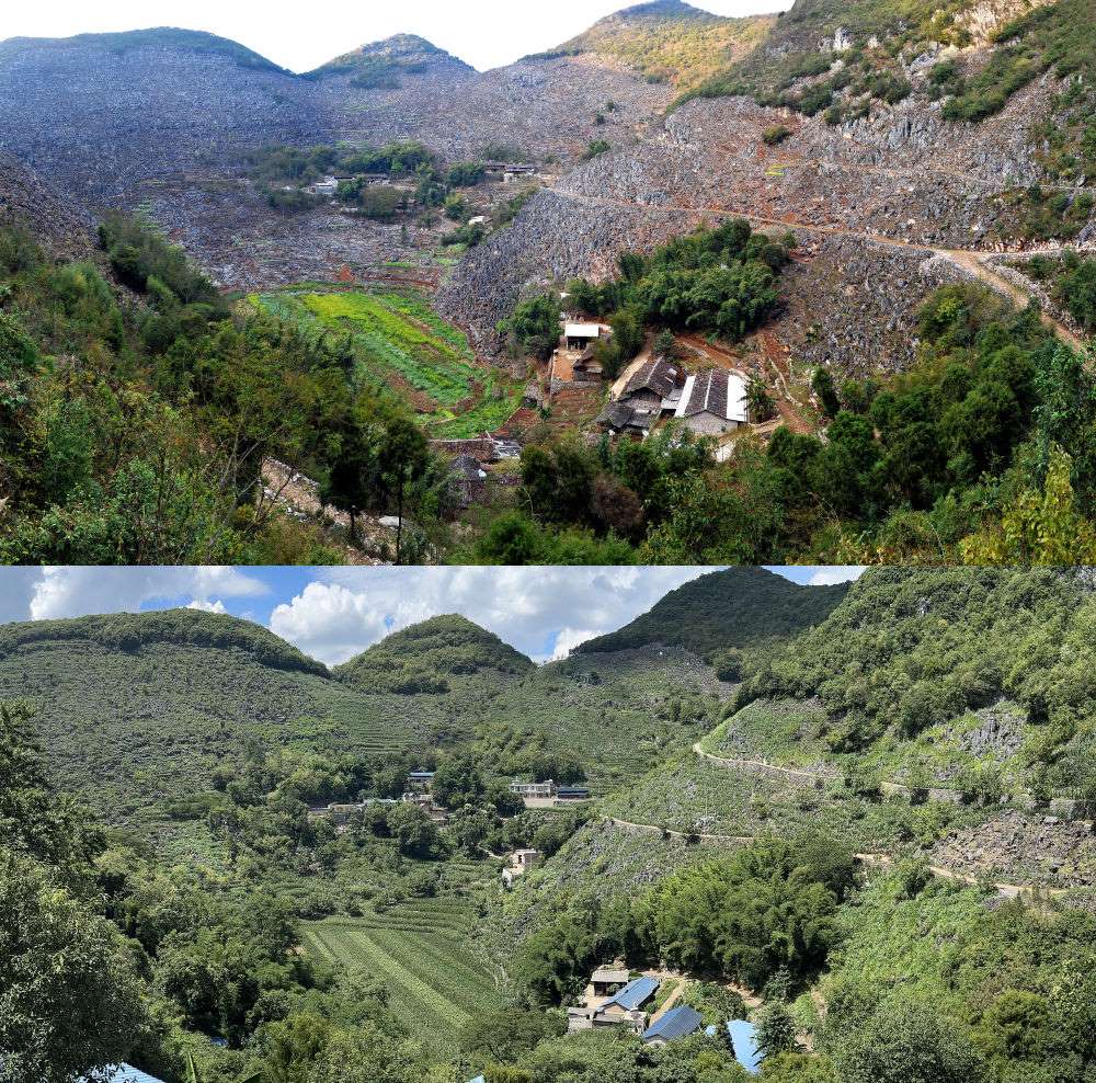拼版照片:上圖為1991年拍攝的西疇縣大鄔麻村改造前的石漠化情況(西疇縣融媒體中心供圖);下圖為2023年7月26日拍攝的西疇縣大鄔麻村改造后的情況(新華社記者 費茂華 攝)。