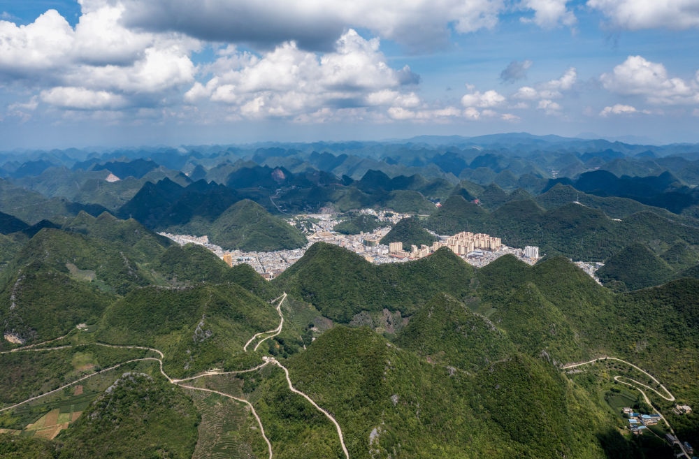 這是7月26日拍攝的西疇縣山間公路一景,遠處是縣城。新華社記者 陳欣波 攝