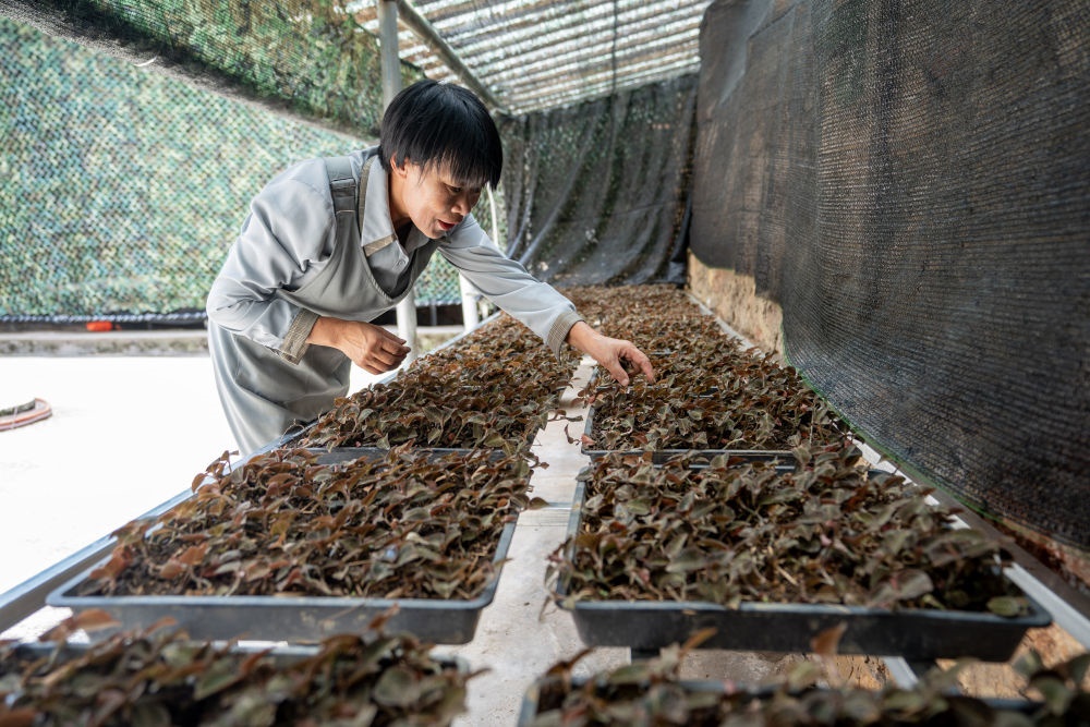 7月27日,謝成芬在家中搭建的大棚內(nèi)打理人工種植的金線蓮植株。新華社記者 陳欣波 攝