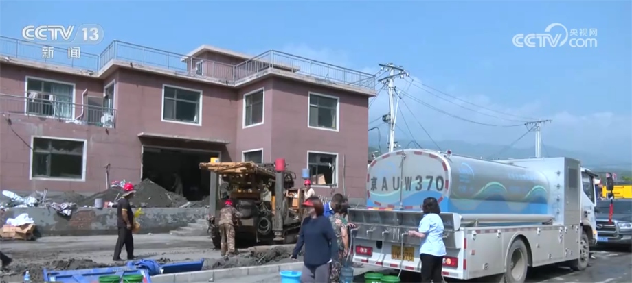 在北京市房山區(qū)西班各莊村,由于洪水侵襲,當(dāng)?shù)厮淳粵_毀,230戶村民出現(xiàn)飲水困難。當(dāng)?shù)厮块T立即派出應(yīng)急送水車,同時集結(jié)勘探隊、機械設(shè)備,用最快的速度更新水源。?