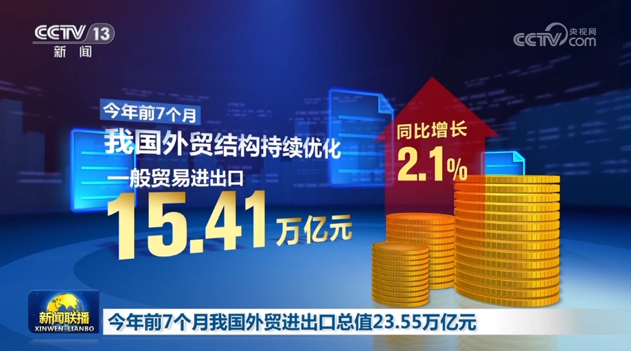 央視網(wǎng)消息(新聞聯(lián)播):海關(guān)總署今天(8月8日)對外公布,今年前7個月,我國貨物貿(mào)易進出口總值23.55萬億元,外貿(mào)運行平穩(wěn)、符合預期。