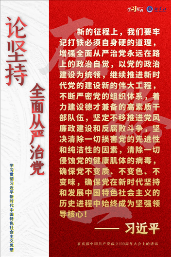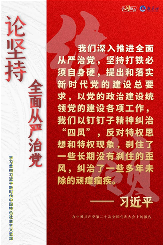 黨的十八大以來(lái),以習(xí)近平同志為核心的黨中央把全面從嚴(yán)治黨作為新時(shí)代黨的建設(shè)的鮮明主題,將這一戰(zhàn)略方針貫穿中國(guó)特色社會(huì)主義事業(yè)全過(guò)程和黨的建設(shè)各方面。