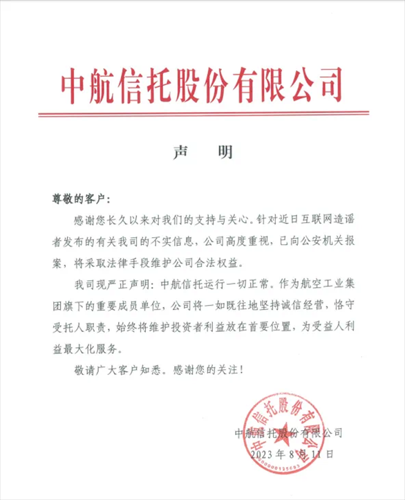 中航信托股份有限公司(下稱“中航信托”)在微信官方公眾號發(fā)文回應稱,“針對近日互聯(lián)網(wǎng)造謠者發(fā)布的有關我司的不實信息,公司高度重視,已向公安機關報案,將采取法律手段維護公司合法權益。我司現(xiàn)嚴正聲明:中航信托運行一切正常。作為航空工業(yè)集團旗下的重要成員單位,公司將一如既往地堅持誠信經營,恪守受托人職責,始終將維護投資者利益放在首要位置,為受益人利益最大化服務?!?/p>