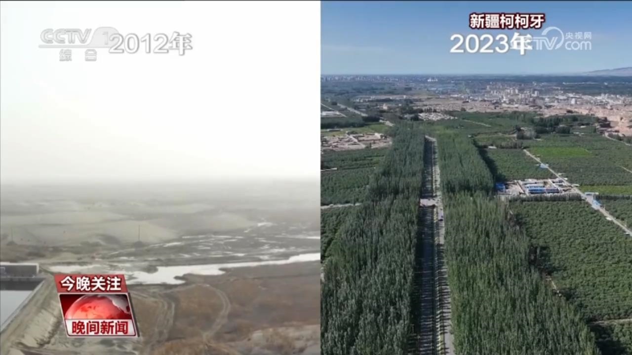 新疆阿克蘇地區(qū)的柯柯牙曾經(jīng)是南疆風(fēng)沙策源地之一。30年來,面對(duì)柯柯牙缺水和土壤鹽堿含量高的情況,當(dāng)?shù)叵到y(tǒng)推進(jìn)山水林田湖草沙一體化保護(hù)和系統(tǒng)治理,柯柯牙綠化工程造林共計(jì)120.26萬(wàn)畝,累計(jì)栽植樹木1400萬(wàn)株,荒漠變?yōu)榱趾?,最終在貧瘠的戈壁荒漠中,造就了一道“綠色長(zhǎng)城”。