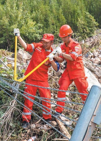 8月3日,中國(guó)安能集團(tuán)組織黨員突擊隊(duì)前往北京市門頭溝區(qū)進(jìn)行道路搶通工作。圖為兩名隊(duì)員在234國(guó)道清理障礙。本報(bào)記者 張武軍攝