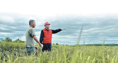 8月12日,國(guó)網(wǎng)黑龍江電力李慶長(zhǎng)共產(chǎn)黨員服務(wù)隊(duì)隊(duì)長(zhǎng)梅宏剛(右)在五常市安家鎮(zhèn)幫助農(nóng)戶開(kāi)展災(zāi)后重建服務(wù)工作。王 萍攝
