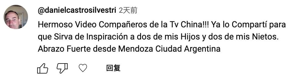 網友danielcastrosilvestri:“中國電視臺的朋友們,這個視頻太好看了?。。∥野阉窒沓鋈?,希望它能夠給我的兩個孩子和兩個孫子帶來啟發(fā)。我來自阿根廷的門多薩市,致禮。”