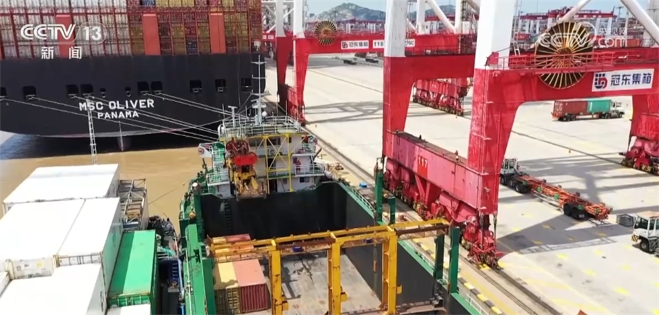 在洋山港三期冠東碼頭,兩艘大型遠(yuǎn)洋集裝箱船中間的這艘小船是來自江蘇太倉(cāng)港的快航班輪,它剛剛完成200多個(gè)集裝箱裝卸。通過水路完成“水水中轉(zhuǎn)”,將這些集裝箱裝上遠(yuǎn)洋貨輪出口海外,無需轉(zhuǎn)關(guān)申報(bào)或倉(cāng)儲(chǔ)停留,實(shí)現(xiàn)了聯(lián)動(dòng)接卸。