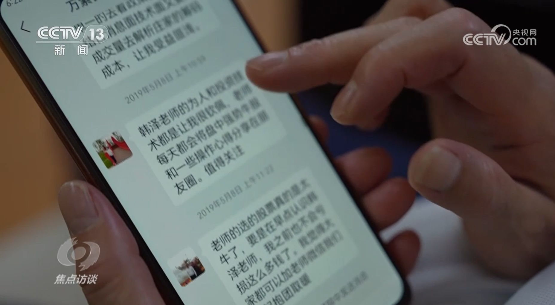 王洋:“我們那個(gè)業(yè)務(wù)號(hào)會(huì)在群里面烘托‘韓澤’老師這個(gè)號(hào),夸他,一些恭維的話(huà),跟著‘韓澤’老師賺錢(qián)指日可待這些?!?/p>