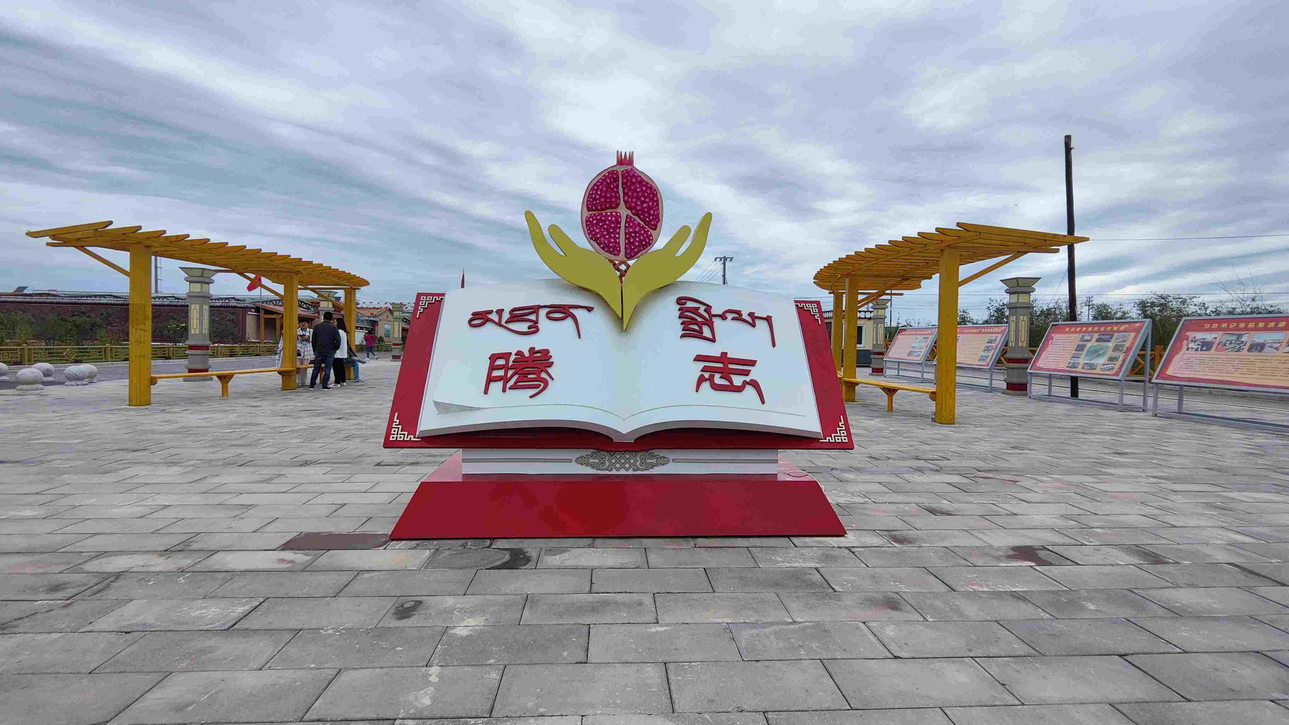 這些向好的變化離不開每一位村民的團(tuán)結(jié)友愛、互幫互助。村口的廣場中間有一本打開的書,書頁上一雙手托舉著一個鮮艷的石榴,這就是果洛藏貢麻村新修建的“騰志”廣場?!膀v志”在藏語中意為“團(tuán)結(jié)”,這也寓意著各民族像石榴籽一樣緊緊抱在一起,共育團(tuán)結(jié)花,共享幸福果。