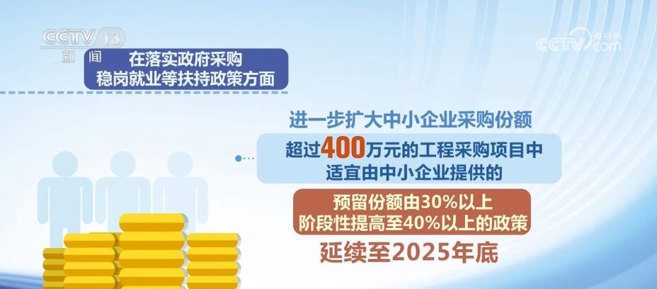 在落實政府采購、穩(wěn)崗就業(yè)等扶持政策方面,進一步擴大中小企業(yè)采購份額,超過400萬元的工程采購項目中適宜由中小企業(yè)提供的,預(yù)留份額由30%以上階段性提高至40%以上的政策延續(xù)至2025年底;中小微企業(yè)招用符合條件的畢業(yè)年度或離校2年內(nèi)未就業(yè)高校畢業(yè)生、登記失業(yè)青年,簽訂1年以上勞動合同的,可按規(guī)定申請一次性吸納就業(yè)補貼;符合條件的中小微企業(yè)可按不超過企業(yè)及其職工上年度實際繳納失業(yè)保險費的60%申請失業(yè)保險穩(wěn)崗返還;對招用畢業(yè)年度和離校2年內(nèi)未就業(yè)高校畢業(yè)生的小微企業(yè),按規(guī)定落實社會保險補貼政策。