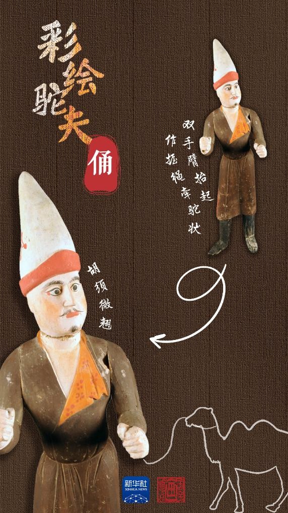 吐魯番阿斯塔那206號(hào)墓是唐代高昌左衛(wèi)大將軍張雄與妻子的合葬墓。墓中出土的木俑做工精湛,大多是由中原生產(chǎn),具有明顯的盛唐風(fēng)格,彩繪駝夫俑便出土于此。駝夫?yàn)楹四凶有蜗?,深目高鼻,胡須微翹,頭戴高聳折沿白氈尖帽,身著褐色掩襟長(zhǎng)袍,足穿高棱黑靴。此俑為分段雕刻膠合而成,再施以彩繪,面部表情富有神韻,惟妙惟肖。通過(guò)駝夫生動(dòng)的神情仿佛看到他牽著駱駝,帶著各色商品,沿著絲綢之路慢慢走來(lái)。