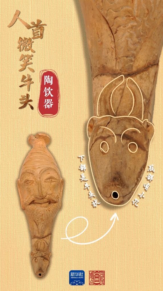 當(dāng)中國(guó)絲綢的美譽(yù)經(jīng)由古絲綢之路在西亞、歐洲等地傳揚(yáng)時(shí),西方文明也穿過(guò)風(fēng)沙與長(zhǎng)歌,在中國(guó)留下了印記。人首微笑牛頭陶飲器出土于和田地區(qū)約特干遺址,為唐代時(shí)期文物。飲器上部為人首形,下部是牛頭狀,底部帶小圓孔,上下兩部分內(nèi)腔相通。人首上唇胡須外展卷翹,面帶微笑。牛頭微微上翹,牛角豎立攏圓。這種飲器造型源自“來(lái)通”,即末端為動(dòng)物形或人首形的角杯,是小亞細(xì)亞和地中海地區(qū)常見的飲酒器具,絲綢之路沿線國(guó)家都有類似文物出土。