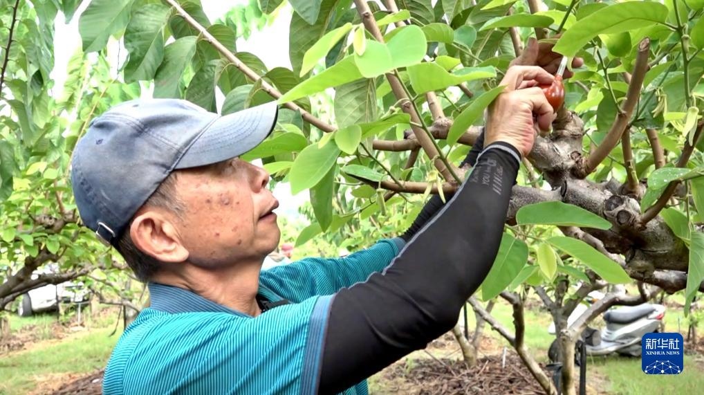 果農蔡鴻義在為番荔枝授粉(8月9日攝)。新華社記者 王承昊 攝