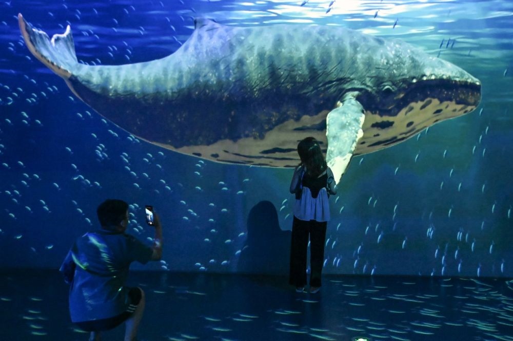 7月29日,游客在國家海洋博物館體驗(yàn)沉浸式互動(dòng)數(shù)字藝術(shù)作品《鯨奇物語》光影藝術(shù)展。新華社記者 孫凡越 攝