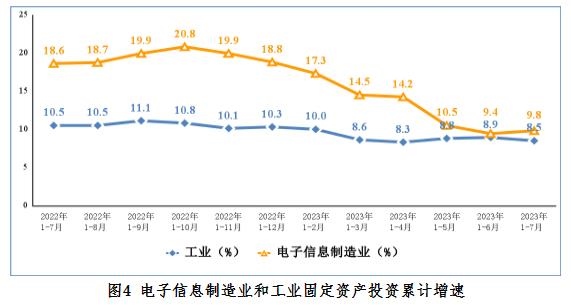 1—7月份,電子信息制造業(yè)固定資產(chǎn)投資同比增長9.8%,比同期工業(yè)投資增速高1.3個百分點(diǎn),但比高技術(shù)制造業(yè)投資增速低1.7個百分點(diǎn)。