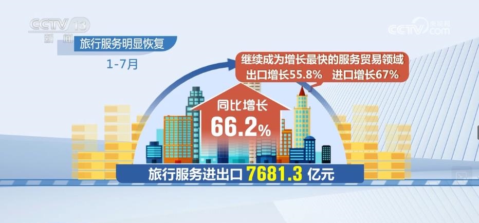旅行服務明顯恢復。1月—7月,旅行服務進出口7681.3億元,同比增長66.2%,繼續(xù)成為增長最快的服務貿易領域。其中,出口增長55.8%、進口增長67%。