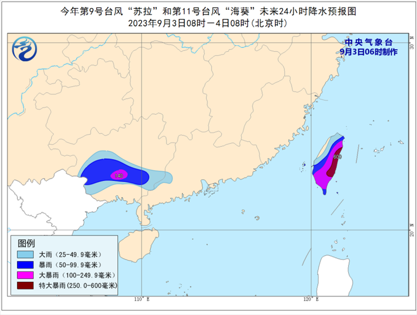 降水預(yù)報(bào):9月3日08時(shí)至4日08時(shí),受“蘇拉”和“海葵”影響,廣西中南部、廣東西南部、臺(tái)灣島等地部分地區(qū)有大到暴雨,其中,廣西中南部、臺(tái)灣島中東部等地部分地區(qū)有大暴雨,臺(tái)灣島東部部分地區(qū)有特大暴雨(250-600毫米)。