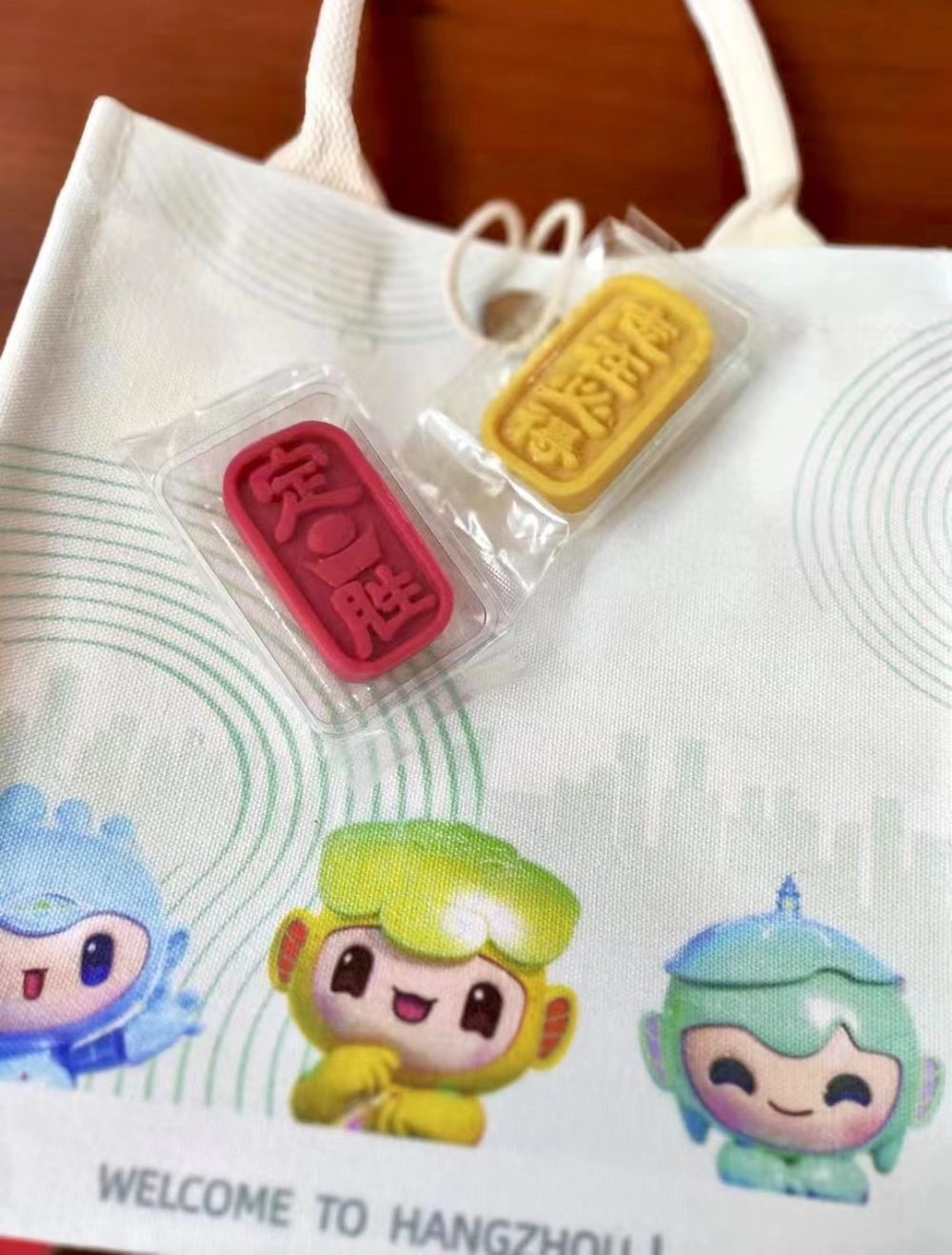 “志愿者們可以在手賬本上記錄志愿服務(wù)過(guò)程中的點(diǎn)點(diǎn)滴滴,留下美好的亞運(yùn)回憶;特制的行李卡牌可以幫助他們標(biāo)記自己的物品和行李;而一紅一黃兩塊定勝糕上面分別寫(xiě)有‘定勝’以及‘志在必得’的字樣,則是為他們加油打氣。”杭州亞運(yùn)村人事與志愿者管理中心副主任、浙江外國(guó)語(yǔ)學(xué)院團(tuán)委書(shū)記邱萍說(shuō)。