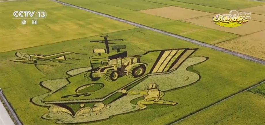 總臺(tái)央視記者 蔣樹林:金秋9月的稻田是什么顏色的?9月的稻香又是什么味道?來這里,有可能會(huì)找到您想要的答案。我現(xiàn)在是在黑龍江北大荒閆家崗農(nóng)場。大家來看,這個(gè)稻田觀景臺(tái)有十多米高,因此站在這里,秋日稻田大片的圖案映入眼簾,今年稻田畫以“鄉(xiāng)村振興”“數(shù)字農(nóng)業(yè)”為主題,生動(dòng)展現(xiàn)了“讓農(nóng)業(yè)更美好、讓農(nóng)民更幸?!钡拿篮迷妇?。稻田畫是農(nóng)民們勤勞與智慧的展現(xiàn),他們用稻田畫為家鄉(xiāng)水稻代言,而對(duì)于在黑土地打拼的北大荒人而言,還有更重要的意義。