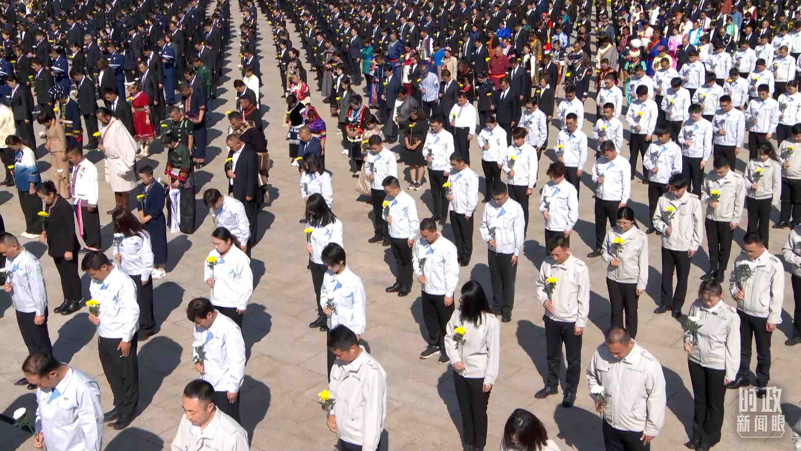 △首都各界代表依次走到紀(jì)念碑碑前,獻(xiàn)上手中鮮花。(總臺(tái)央視記者段德文、鄂介甫拍攝)