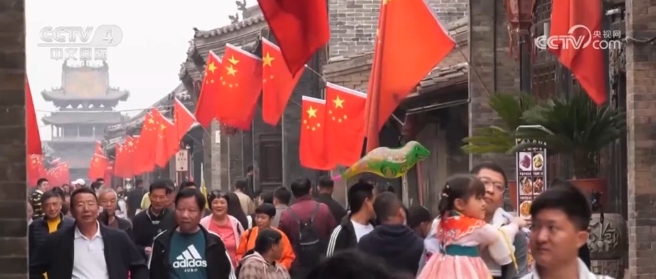 在山西平遙、廣西陽朔、江蘇泰州等地,一面面國旗熱烈醒目、一條條街道花團(tuán)錦簇。