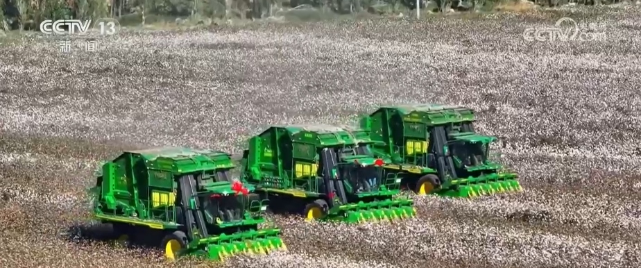 2023年,當(dāng)?shù)孛藁ǚN植面積74萬(wàn)畝。在瑪納斯縣涼州戶(hù)鎮(zhèn)呂家莊村的萬(wàn)畝棉田里,3臺(tái)新引進(jìn)的棉花采收打包一體機(jī)正在采收棉花。采棉機(jī)能夠高效快速地將棉花從棉稈上脫離,采凈率高達(dá)95%以上。一臺(tái)采棉機(jī)平均每天可采收700多畝棉花,相當(dāng)于1000名拾花工勞動(dòng)量的總和。