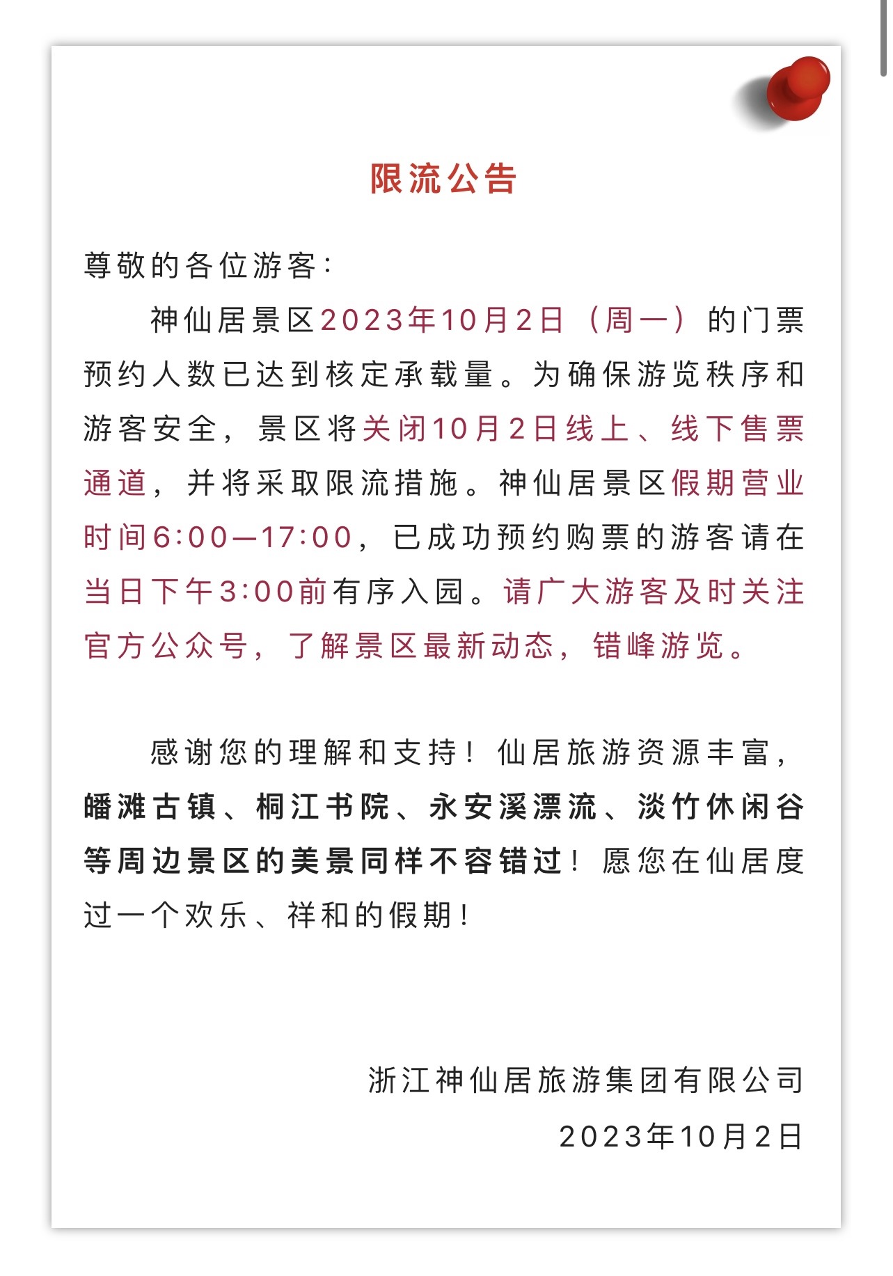 臺(tái)州神仙居景區(qū)于10月2日零點(diǎn)就發(fā)布當(dāng)日門票已約滿的消息。