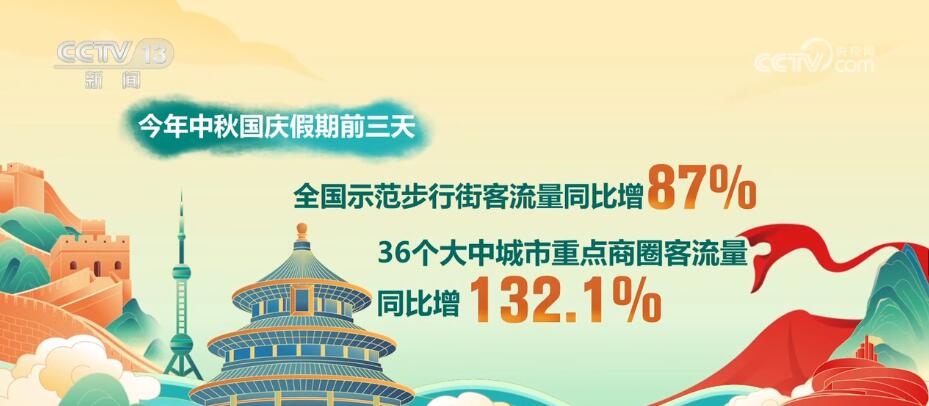 商務(wù)部數(shù)據(jù)顯示,假期前三天,重點(diǎn)商圈人氣紅火。全國示范步行街客流量同比增長87%,36個(gè)大中城市重點(diǎn)商圈客流量同比增長132.1%。