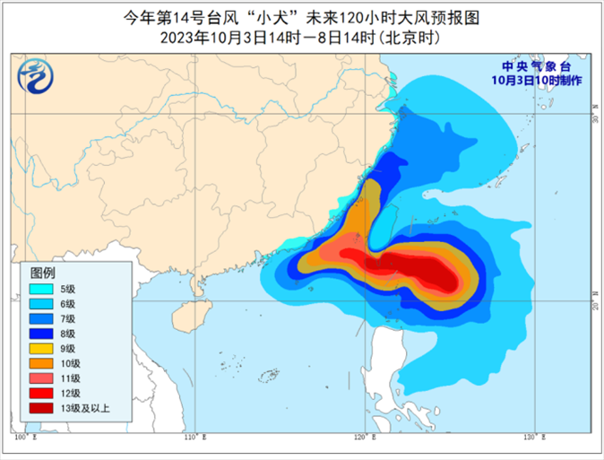 大風(fēng)預(yù)報:3日下午至8日,臺灣以東洋面、巴士海峽、東海大部、臺灣海峽、南海東北部以及杭州灣、浙江沿海、福建沿海、廣東東南部沿海以及臺灣島沿海將有6~8級大風(fēng),其中,臺灣以東洋面、巴士海峽、臺灣海峽、南海東北部部分海面、福建沿海、廣東東南部沿海、臺灣島東南部和西部沿海的風(fēng)力將有9~12級,“小犬”中心經(jīng)過的附近海面風(fēng)力可達13~16級,陣風(fēng)17級。