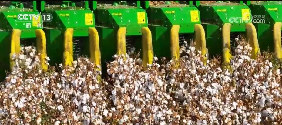 作為棉花主產(chǎn)區(qū),新疆棉花陸續(xù)進入采收季?,F(xiàn)在您看到的是位于新疆昌吉瑪納斯縣的棉田。采棉機在田里穿行,所到之處,棉花從棉稈上脫離,氣流將棉花推送到儲存棉箱,采凈率高達(dá)95%以上。這樣一臺采棉機每天可采收700余畝棉花。瑪納斯是國家級優(yōu)質(zhì)商品棉生產(chǎn)基地。從播種到采收,這里的機械化,大大提高作業(yè)速度和棉花質(zhì)量。