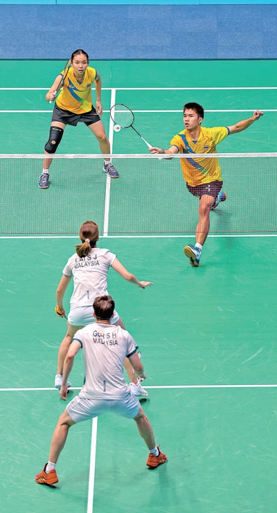 10月4日,杭州亞運(yùn)會(huì)羽毛球混合雙打1/8決賽,馬來(lái)西亞體育代表團(tuán)組合對(duì)陣泰國(guó)體育代表團(tuán)組合。圖為雙方運(yùn)動(dòng)員在比賽中。本報(bào)記者 伊霄攝