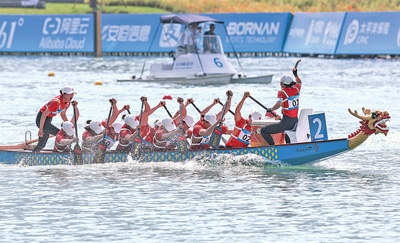 10月4日,杭州亞運(yùn)會(huì)龍舟項(xiàng)目女子組12人龍舟200米直道競(jìng)速賽,中國(guó)體育代表團(tuán)選手在比賽中。新華社記者 孟晨光攝