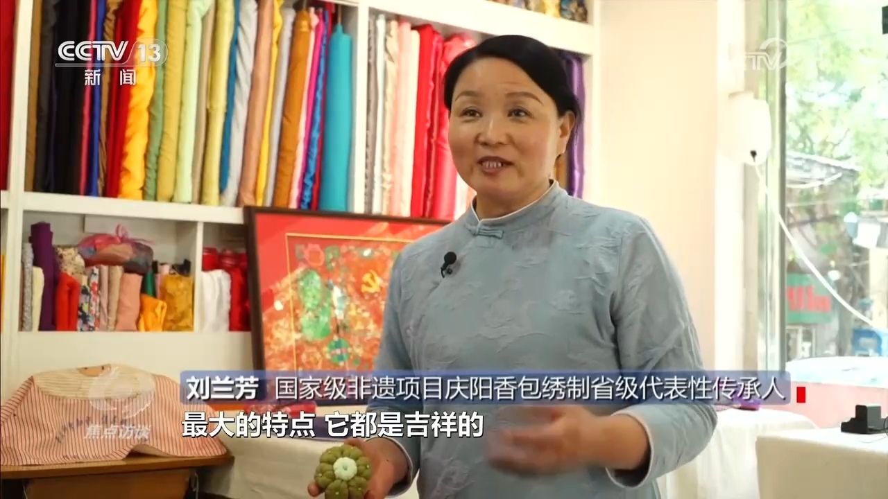 國家級非遺項目慶陽香包繡制省級代表性傳承人劉蘭芳:“這個針法的特點是一根針一根線從頭到尾不能斷頭,要一次完成,而且左右對稱、上下對稱,我們祖祖輩輩傳承到今天。”