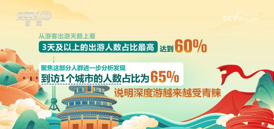 中國移動梧桐大數(shù)據(jù)借助通信服務(wù)、算力網(wǎng)絡(luò),對全國用戶漫游、通信等數(shù)據(jù)進行統(tǒng)計分析后發(fā)現(xiàn),從9月29日至10月6日,各地旅游人數(shù)和相關(guān)消費均大幅上漲。其中,短途游熱度不減,中長途游持續(xù)升溫。200公里以內(nèi)的短途游占比達到38%;200—500公里的中等距離出游占比32%;500公里以上長途游占比為30%。從游客出游天數(shù)上看,3天及以上的出游人數(shù)占比最高,達到60%。聚焦這部分人群進一步分析發(fā)現(xiàn),到訪1個城市的人數(shù)占比為65%,說明深度游越來越受青睞。