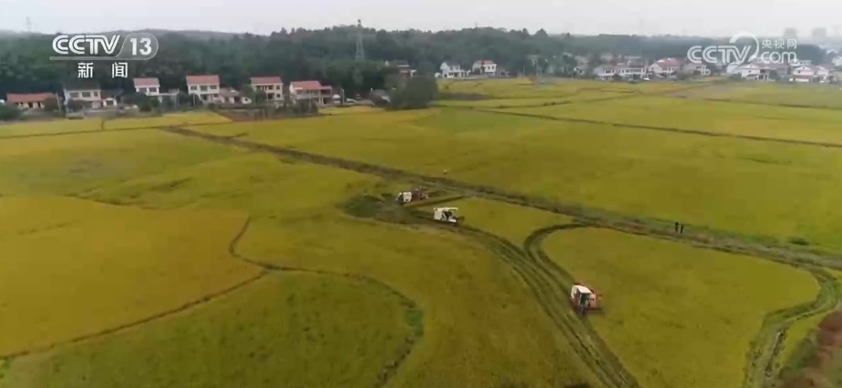 在湖南省常德市鼎城區(qū),連片的中稻迎來豐收。種糧大戶陳元普調(diào)度了3臺收割機前來搶收,很快30多畝稻田就完成了收割。