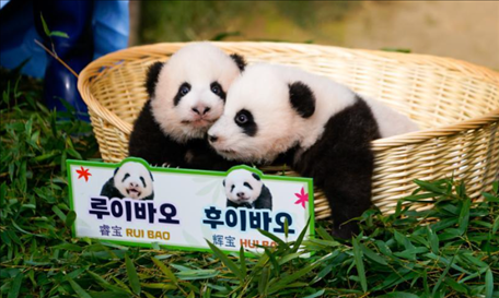·旅韓大熊貓雙胞胎幼崽“睿寶”“輝寶”首次公開(kāi)露面。