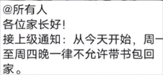 ·江蘇多所小學(xué)要求學(xué)生周一到周四晚不允許帶書包回家?教育局回應(yīng):本意是控制學(xué)生作業(yè)量,形式上的禁止已通知糾正。