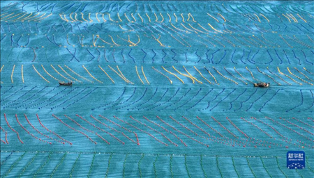 金秋時(shí)節(jié),在榮成市愛(ài)倫灣海洋牧場(chǎng)生態(tài)養(yǎng)殖區(qū),漁民駕駛漁船、舢板出海作業(yè)。