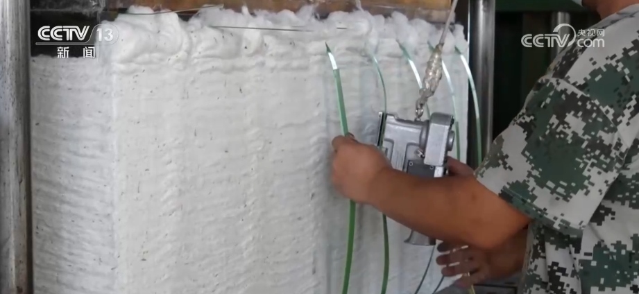 在當(dāng)?shù)氐拿藁庸S車間內(nèi)機器轟鳴,工人們有序地將剛收回來的棉花裝卸、碼垛。