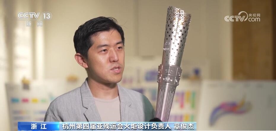 杭州第四屆亞殘運(yùn)會火炬設(shè)計負(fù)責(zé)人 章俊杰:玉琮是實證中華五千年(文明史)的良渚(遺址)文明當(dāng)中的一個重要禮器,我們把玉琮作為核心意象,外方內(nèi)圓,我們在舉起火炬的時候,所有人的視覺焦點玉琮它承上啟下,分別代表了不同的寓意。承上,我們用點點的星光匯聚成桂花桂冠,可以看到星光越來越稠密,這是我們希望體現(xiàn)整個火炬設(shè)計的積極向上的那種力量感;玉琮往下,在這個地方設(shè)計有幾十條的科技線,它就好像是綿延著人類的歷史和城市科技的脈絡(luò)。