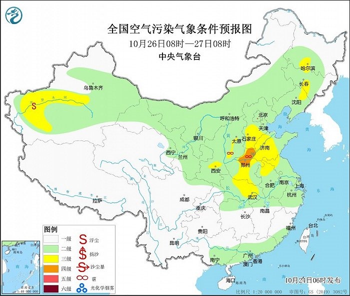 央視網(wǎng)消息:據(jù)中央氣象臺網(wǎng)站消息,10月24日至25日,華北中南部、黃淮北部等地大氣擴散條件較差,部分地區(qū)有輕至中度霾,北京南部、天津、河北中部局地可達重度霾。24日早晨至上午,北京南部、天津中北部、河北中部、江蘇中南部等地的部分地區(qū)有大霧,局地有強濃霧。26日凌晨起,受冷空氣影響,華北、黃淮等地大氣擴散條件自北向南逐漸轉好。