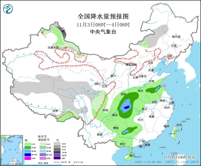 11月2日08時(shí)至3日08時(shí),內(nèi)蒙古東部、黑龍江中北部、新疆北部和南疆盆地南部、西藏北部和東部、青海南部、甘肅西南部等地部分地區(qū)有小到中雪或雨夾雪,其中,新疆阿勒泰北部、黑龍江西北部等地部分地區(qū)有大到暴雪,局地大暴雪(20~25毫米);黑龍江東部、吉林中東部、遼寧北部、陜西南部、四川中東部、重慶、貴州北部、湖北西部、河南西部、海南島、臺(tái)灣島等地部分地區(qū)有小到中雨,其中,四川中部、重慶東北部等地局地有大雨(25~45毫米)。內(nèi)蒙古中東部、吉林中部、遼寧東部、陜西北部等地部分地區(qū)有5~6級(jí)風(fēng)(見(jiàn)圖2)。