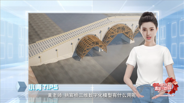 作為黃碩的好幫手,AI數(shù)字人小青給大家介紹說,三維動(dòng)畫中,展現(xiàn)了拱宸橋從選址、圍堰到打樁、搭建、填碎石的全過程,拱宸橋三維數(shù)字化項(xiàng)目成為大運(yùn)河保護(hù)傳承利用的案例之一。