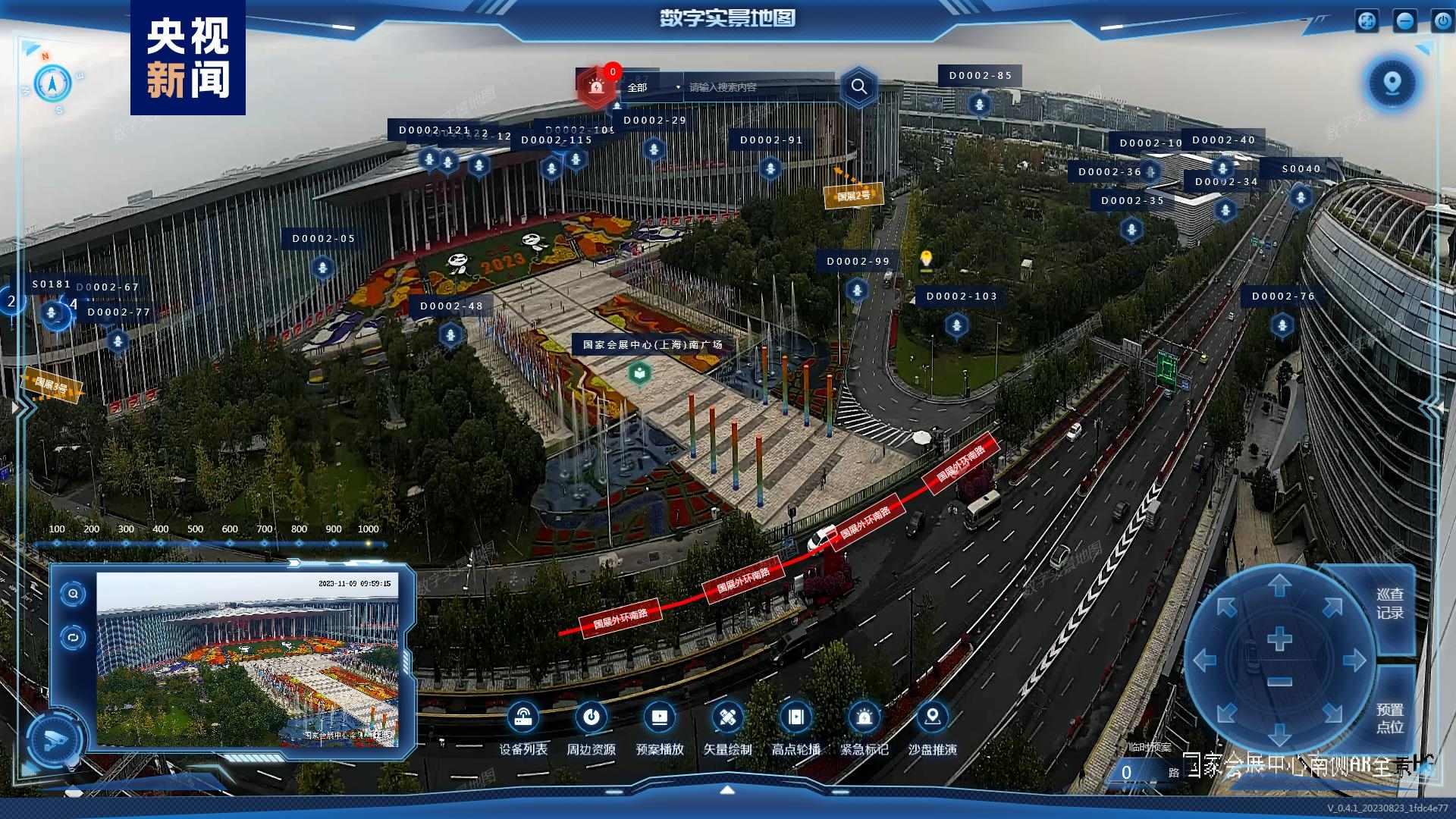 為強化精準指揮調度,消防部門專門制作了國家會展中心的三維模型,將本屆參展的1888個展位全部進行了數字化標識,在指揮平臺主頁面可實現目標展位一鍵搜索和快速定位。以6.1號館為試點,通過激光雷達和可見光融合傳感器進行快速掃描,建立展臺的三維精模,配置安保模型算法,將現場監(jiān)控攝像頭傳回的二維畫面與三維模型匹配,實現虛實場景交互融合。同時通過采集巡館人員面部、著裝等特征信息,利用AI算法,實時在館內人群中標定巡館人員,進行精準定位。一旦發(fā)現異常狀況,指揮部值班人員能快速、精準地向所有駐防人員提供最佳處置線路指引和最優(yōu)輔助決策。