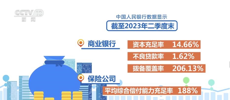 中國人民銀行數(shù)據(jù)顯示,截至2023年二季度末,商業(yè)銀行資本充足率、不良貸款率和撥備覆蓋率分別為14.66%、1.62%和206.13%,保險公司平均綜合償付能力充足率188%,證券公司風險覆蓋率、平均資本杠桿率分別為255.38%、18.78%,信用風險處于可控水平,損失抵御能力總體較為充足。