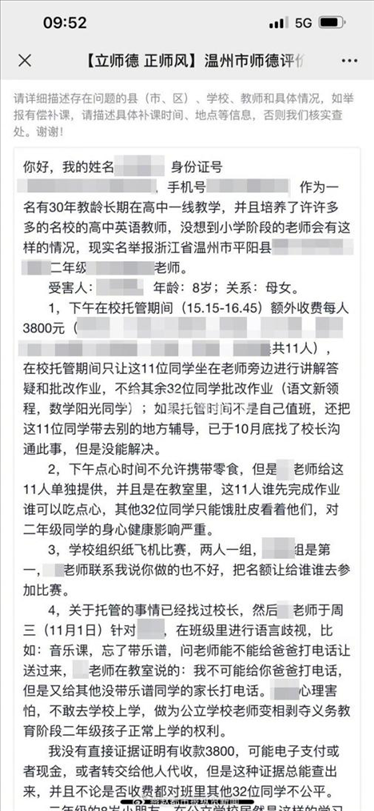 ·溫州一小學老師被舉報開展有償答疑,當?shù)亟逃郑撼闪0嗾{查取證。