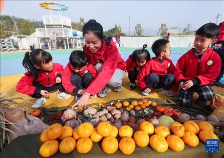 浙江省湖州市長興縣李家巷鎮(zhèn)中心幼兒園開展“冬日校園 樂享豐收”校園豐收節(jié)主題活動。孩子們在老師的帶領(lǐng)下參觀豐收節(jié)農(nóng)作物展、手工藝品展,還參加挑擔(dān)子、運蘿卜、接力送玉米等趣味運動,學(xué)習(xí)知識、鍛煉身體,感受豐收帶來的喜悅。