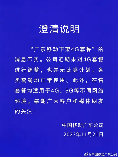 ·中國(guó)移動(dòng)廣東公司:“下架4G套餐”消息不實(shí),也無(wú)此類(lèi)計(jì)劃。